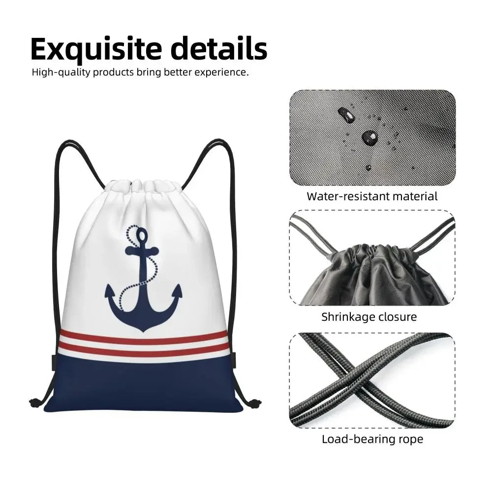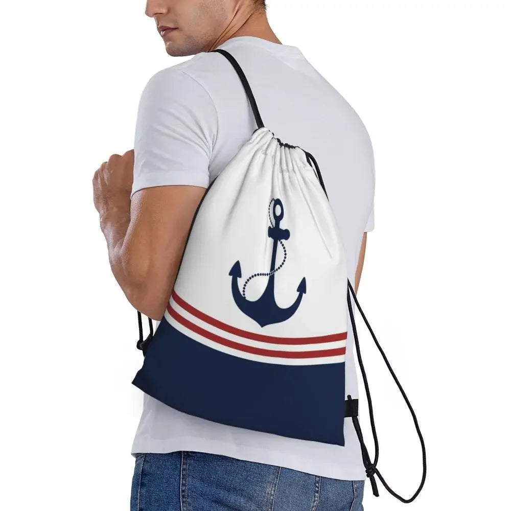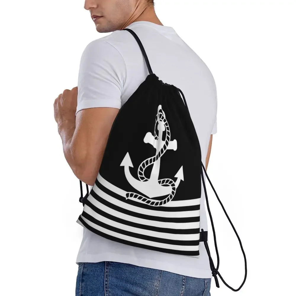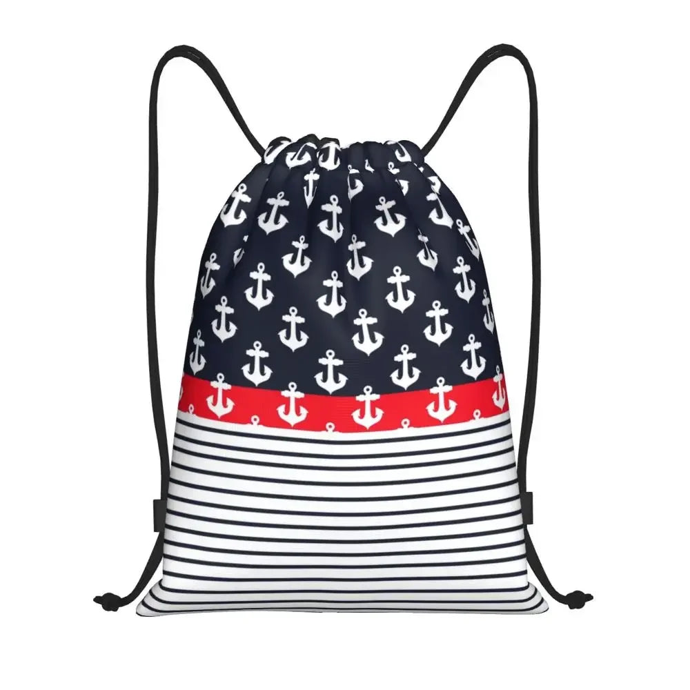 Custom Anchor And Navy Blue Stripes Drawstring Backpack Women Men Gym Sport Sackpack Portable Nautical Sailor Shopping Bag Sack