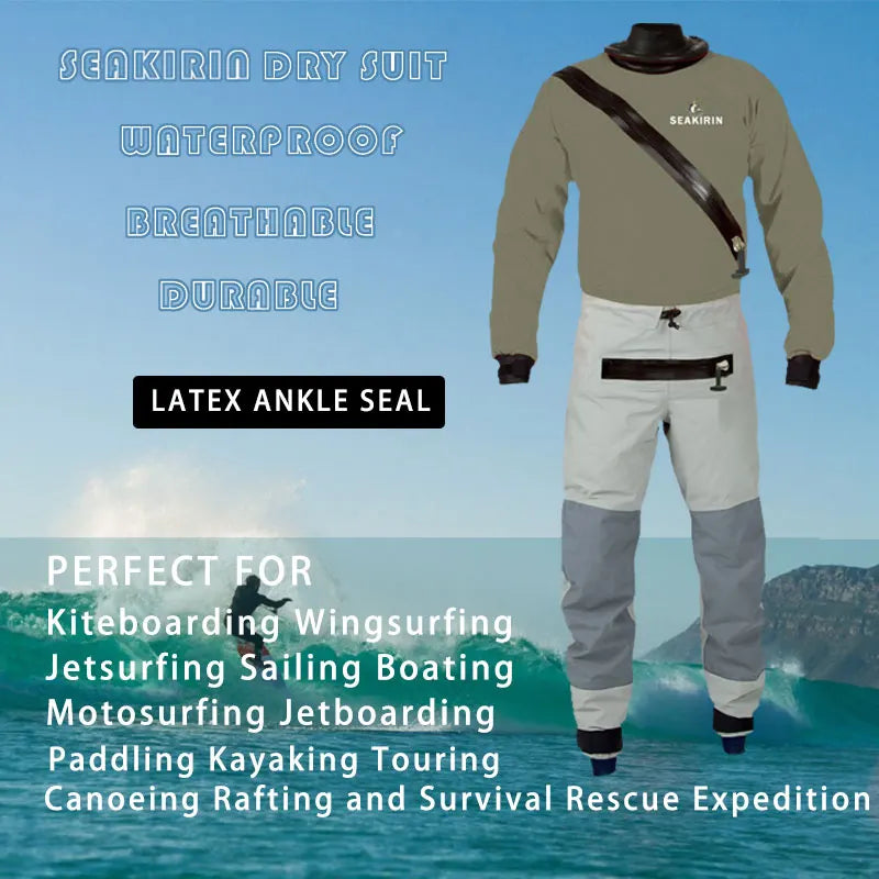 SEAKIRIN's proprietary 4.0 membrane is totally waterproof and breathable, keeping us dry in the water at a lower price than other the same ankle seal dry suits in the markets.  The latex neck, wrist, and ankle gaskets feature hook-and-loop cuffs to seal out moisture.