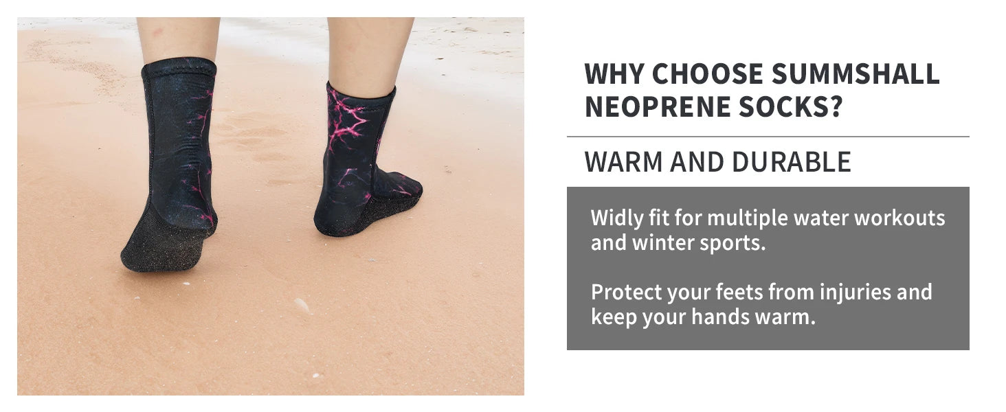 1. Warm and safe during water sports activities: thanks to the unique Summshall sewing technology and the 3 mm SBR neoprene material with excellent cold protection effect, the neoprene socks can largely prevent water from entering the neoprene socks, so that your feet always stay warm during water sports activities.