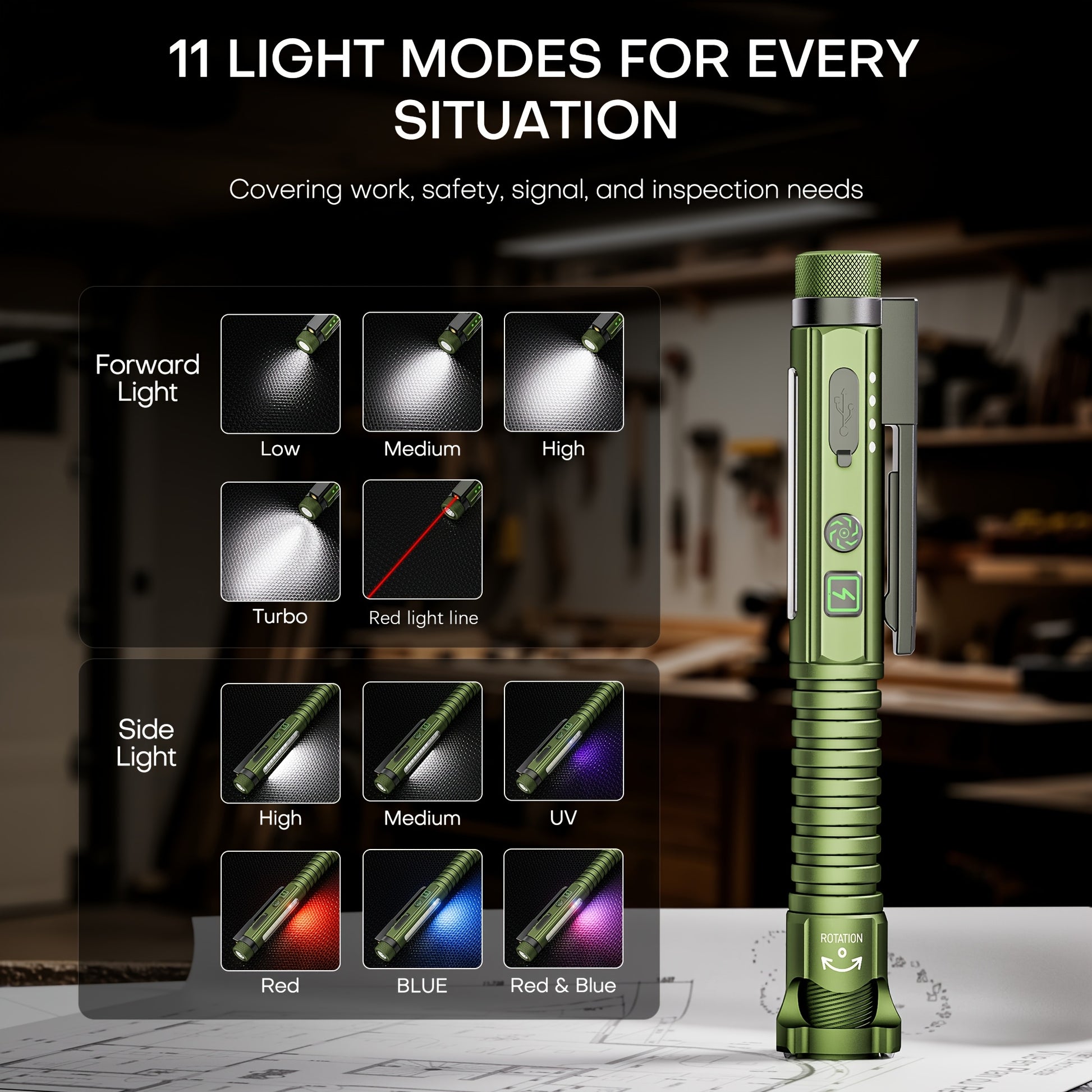 Red Ray Penlight EDC 600LUMEN Rechargeable Portable Flashlight, Ultra-bright Flashlight with Side Light, UV Function, Magnetic Clip And Base, Hidden Bottle Opener, Window Breaker, Suitable for Home, Camping, And Emergency Sit