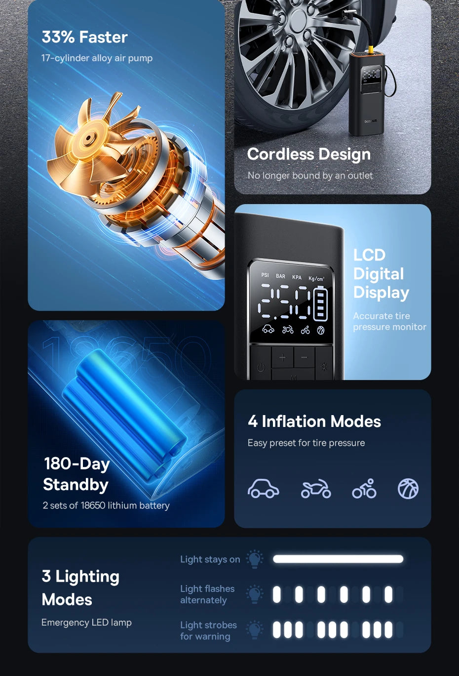 Baseus Wireless Air Pump Portable Air Compressor Smart Digital Electric Car Air Pump for Car Motorcycle Bicycle Inflator Pump