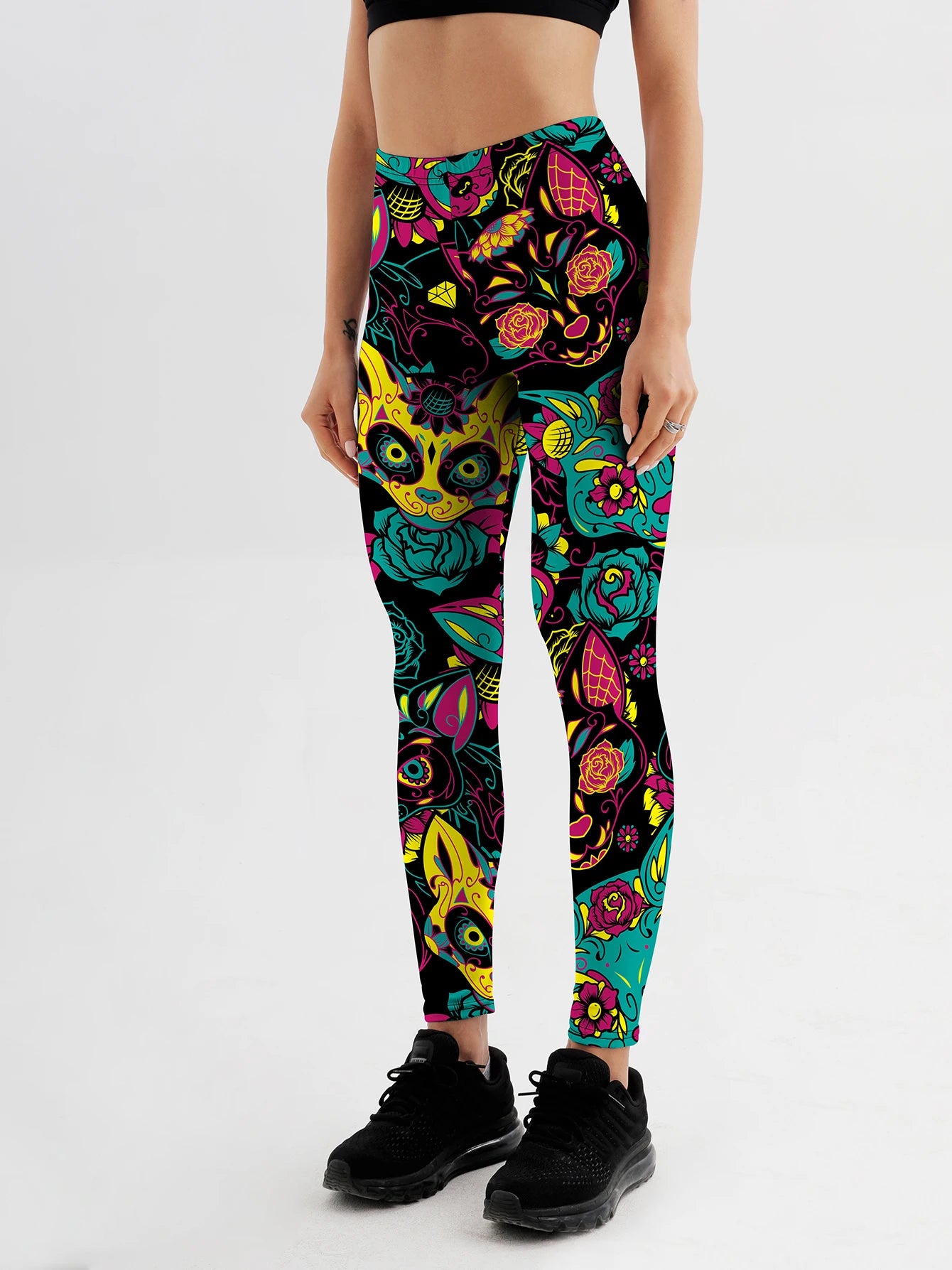 Fashion Women Cute Cat Printed Leggings For Fitness High Waist Gym Legging Push Up Workout Women skull Printed Leggings