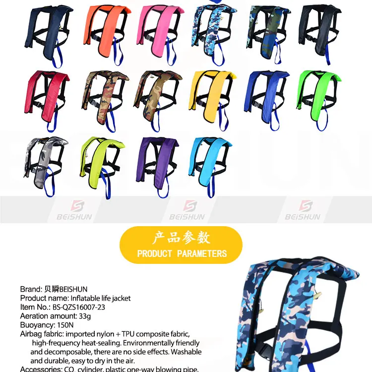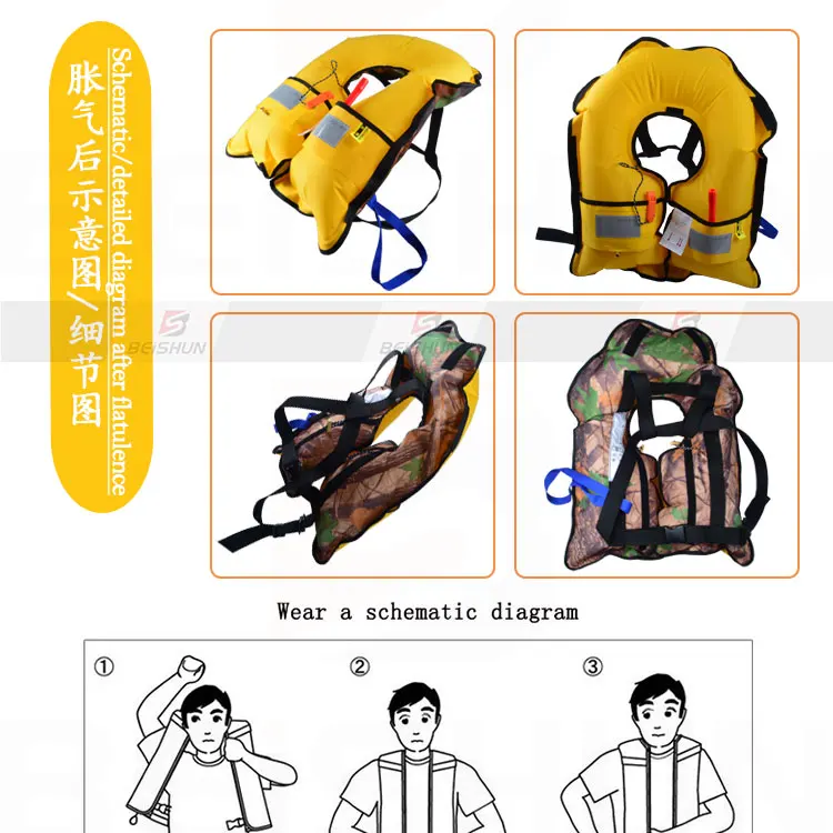 Automatic inflation: After drowning, automatic inflation device will automatically inflatablewithin 5 seconds(you need to buy Co2 cylinder)