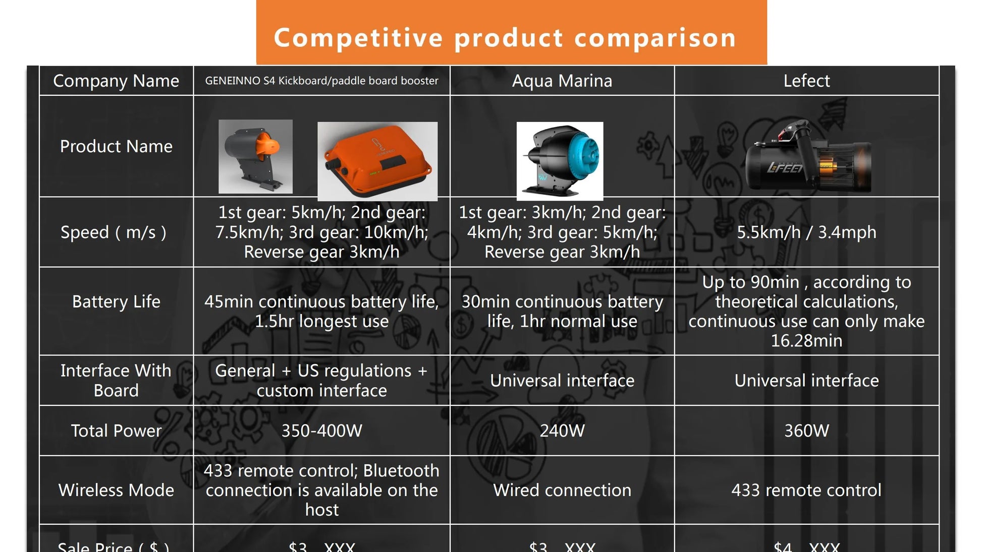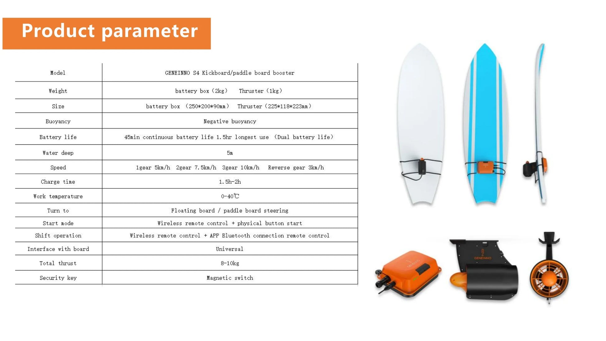 SUP-皮划艇助推器 重量:电池盒(2公斤) 螺旋桨(1公斤) 尺寸:泳池箱(长250*宽200*高90mm) 螺旋桨(长225*宽118*高223mm) 浮力:负浮力 续航时间:45分钟 连续续航1.5小时 最长使用时间(双电池续航) 工作深度:5米 速度:1档5公里/小时 2档75公里/小时 3档10公里/小时 倒档3公里/小时 充电时间: 1.5h~2h 工作温度:0~40°C 转向:浮板转动 开机启动:无线遥控器+物理按键 换档操作:无线遥控器/APP 蓝牙连接遥控器 接口:通用+美标+定制接口 总推力:8-10kg 安全钥匙:磁性开关 儿童安全锁:通过设置